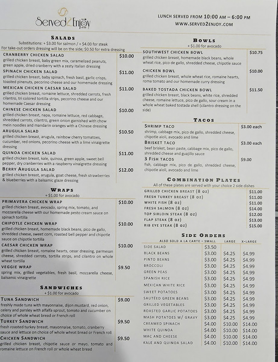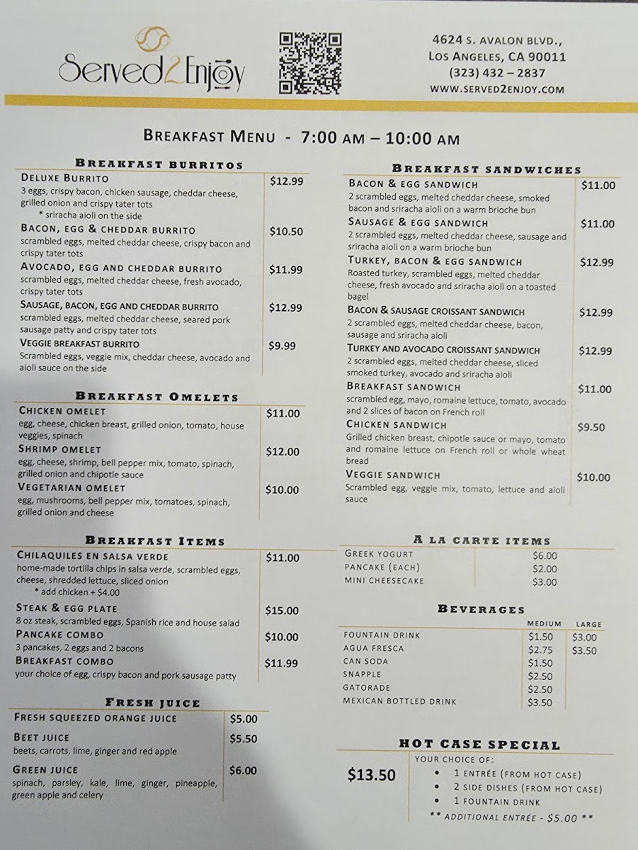 The menu at Served 2 Enjoy offers a variety of delicious breakfast options catering to all tastes. Their Breakfast Burritos include favorites like the Bacon, Egg & Cheddar Burrito, Avocado, Egg and Cheddar Burrito, and the Veggie Breakfast Burrito, all promising a fulfilling start to your day. For those craving a sandwich, the Bacon & Egg Sandwich and Sausage & Egg Sandwich are popular choices, alongside the more indulgent Bacon & Sausage Croissant Sandwich and the Turkey and Avocado Croissant Sandwich. If you’re in the mood for something more substantial, the Chicken Omelet, Shrimp Omelet, and Vegetarian Omelet are great options. For a heartier meal, the Chilaquiles en Salsa Verde and Steak & Egg Plate offer flavorful, satisfying dishes. The Pancake Combo and Breakfast Combo provide classic breakfast staples with a twist. Add-ons like Bacon, Turkey Bacon, Chorizo, and Chicken Sausage give you the option to personalize your meal. For those looking for a lighter bite, the a la carte Greek Yogurt and Pancake are perfect choices, while breakfast sides like Fresh Fruit, Rice, Egg Whites, and Roasted Garlic Potatoes complement any dish. To round off the meal, sip on a Fountain Drink or enjoy a hot Coffee. With such a wide selection of tasty options, Served 2 Enjoy is a perfect spot for a satisfying breakfast experience.